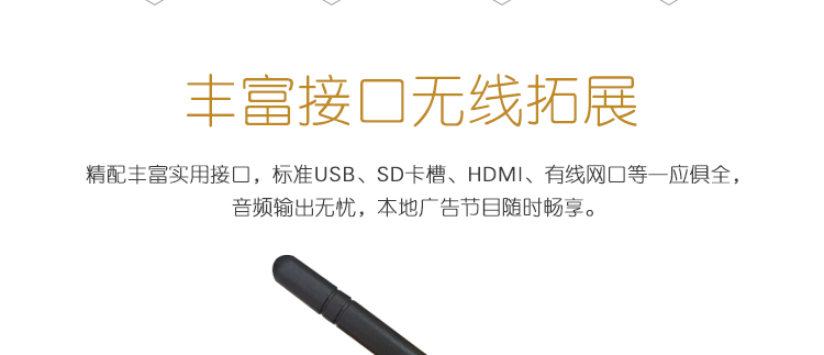 播放盒采用RK3288 四核高性能應(yīng)用處理器平臺(tái),并具有超強(qiáng)的3D加速圖形處理能力和1080P視頻編解碼能力。該產(chǎn)品針對(duì)高清視訊應(yīng)用的長(zhǎng)期穩(wěn)定運(yùn)行要求而設(shè)計(jì),能夠提供極其流暢視訊播放體驗(yàn)。該產(chǎn)品無(wú)風(fēng)扇設(shè)計(jì)、內(nèi)置高品質(zhì)散熱片,非常適合工業(yè)和行業(yè)信息發(fā)布應(yīng)用需求。